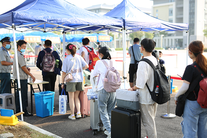 8月29日起,我校龙湖校区、凤阳校区将迎来秋季学期12067名学生返校。29日上午,笔者在两校区学生返校现场看到,返校第一天学校秩序井然,在返校专用通道,测量体温、更换口罩、手部消毒、查验安康码等环节井然有序地进行。“丹桂飘香 热烈欢迎广大同学平安返校”,校园内主干道横幅悬挂,氛围热烈,安静了几个月的校园瞬间热闹起来,蓬勃朝气伴随着同学们的平安归来瞬间充满了整个校园。