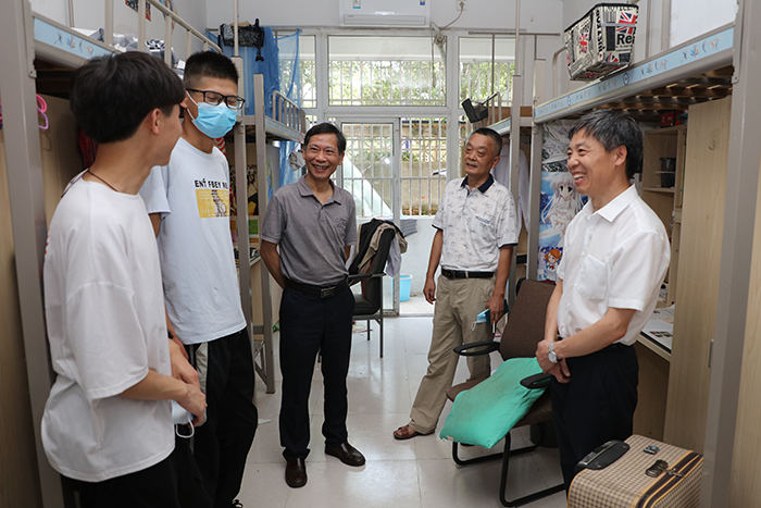 学生返校牵动着校领导的心,上午9时许,校党委书记蒋德勤,党委副书记、校长李震,党委委员、副校长黄远友在有关部门负责同志陪同下全面检查学生返校工作。在各学院学生报到点,校领导详细了解第一批学生返校及防疫物资准备情况,要求各学院本着安全第一的原则精心为返校学生做好服务工作。在学生食堂,校领导认真检查消毒清洁工作,详细了解菜品供应和学生错峰就餐安排情况;在学生宿舍,校领导与刚返校的学生亲切交谈,关切的询问同学们在家期间学习生活情况,热烈欢迎同学们安全返校。校领导对返校报到各项工作表示肯定,要求各部门、各学院继续高度重视疫情防控工作和学生返校工作,及时发现问题,迅速整改落实;关注学生思想动态,做好各类学生的跟踪管理服务;认真思考谋划,统筹做好疫情防控和教育教学工作,确保学生生命安全和身心健康。