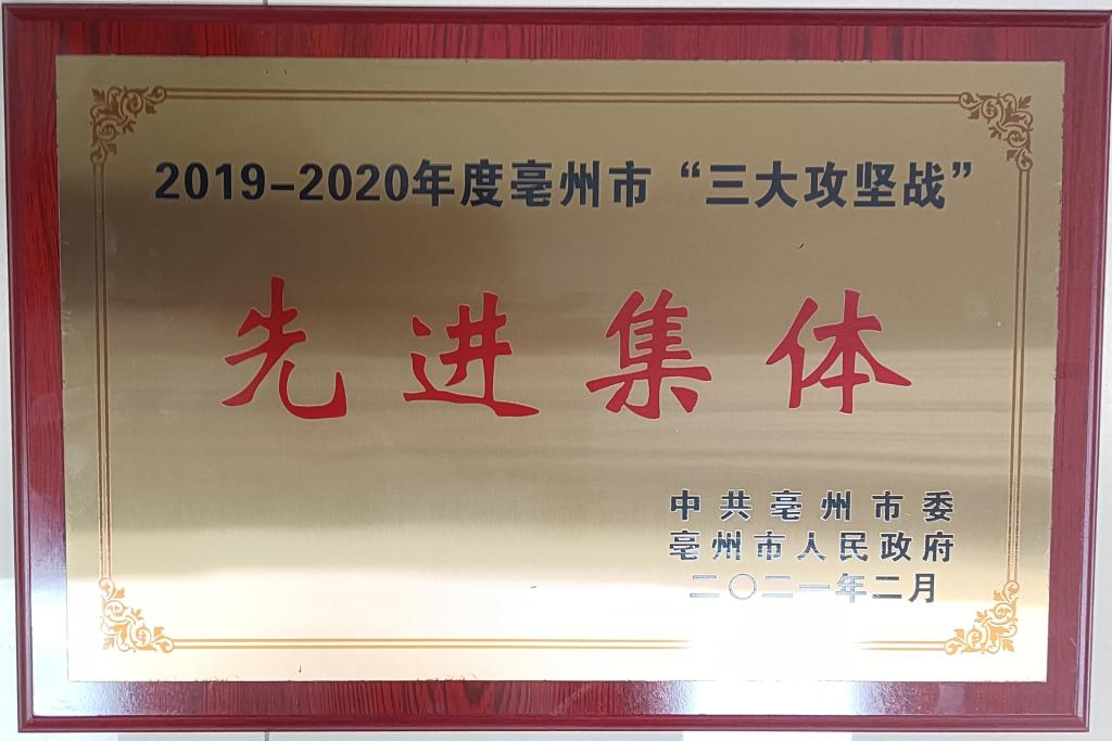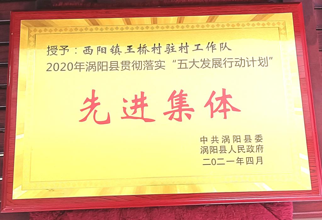 经省委、省政府批准,今年2月份,亳州市委、市政府决定对全市2019和2020年两度在“三大攻坚战”实绩突出、群众评价良好的先进集体和先进个人进行表彰,我校驻涡阳县西阳镇王桥村扶贫工作队获亳州市“三大攻坚战”先进集体荣誉称号。涡阳县委县政府同时授予我校驻村工作队贯彻落实“五大发展行动计划”先进集体荣誉称号。近日,亳州市方面将两块荣誉称号牌匾专门授予我校,表达对第七批驻村工作队特别是对校党委校行政的衷心感谢。