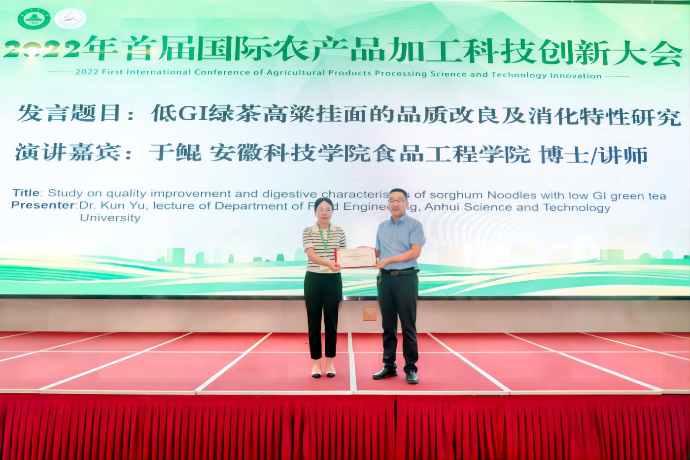为推进农产品加工科技创新,促进成果转化与科技合作,推动农产品加工产业健康可持续发展,由安徽农业大学主办,合肥工业大学、万搏官方网站_万搏(中国)股份有限公司,、滁州学院、皖西学院等单位承办的“2022年首届国际农产品加工科技创新大会”于2022年9月22-24日在安徽合肥召开,由中国工程院院士朱蓓薇教授和谢明勇教授共同担任大会主席。本次大会就国内外农产品贮藏加工技术的研究进展与动态,新成果展示与全产业链对接等进行了深入交流,共谋农产品加工业产业大计。我校党委委员、副院长李升和带领食品工程学院院长杜传来、副院长翟立公和院青年教师陈春旭、杨丽萍、卫兰兰、于鲲、魏照辉及6名研究生应邀参会。