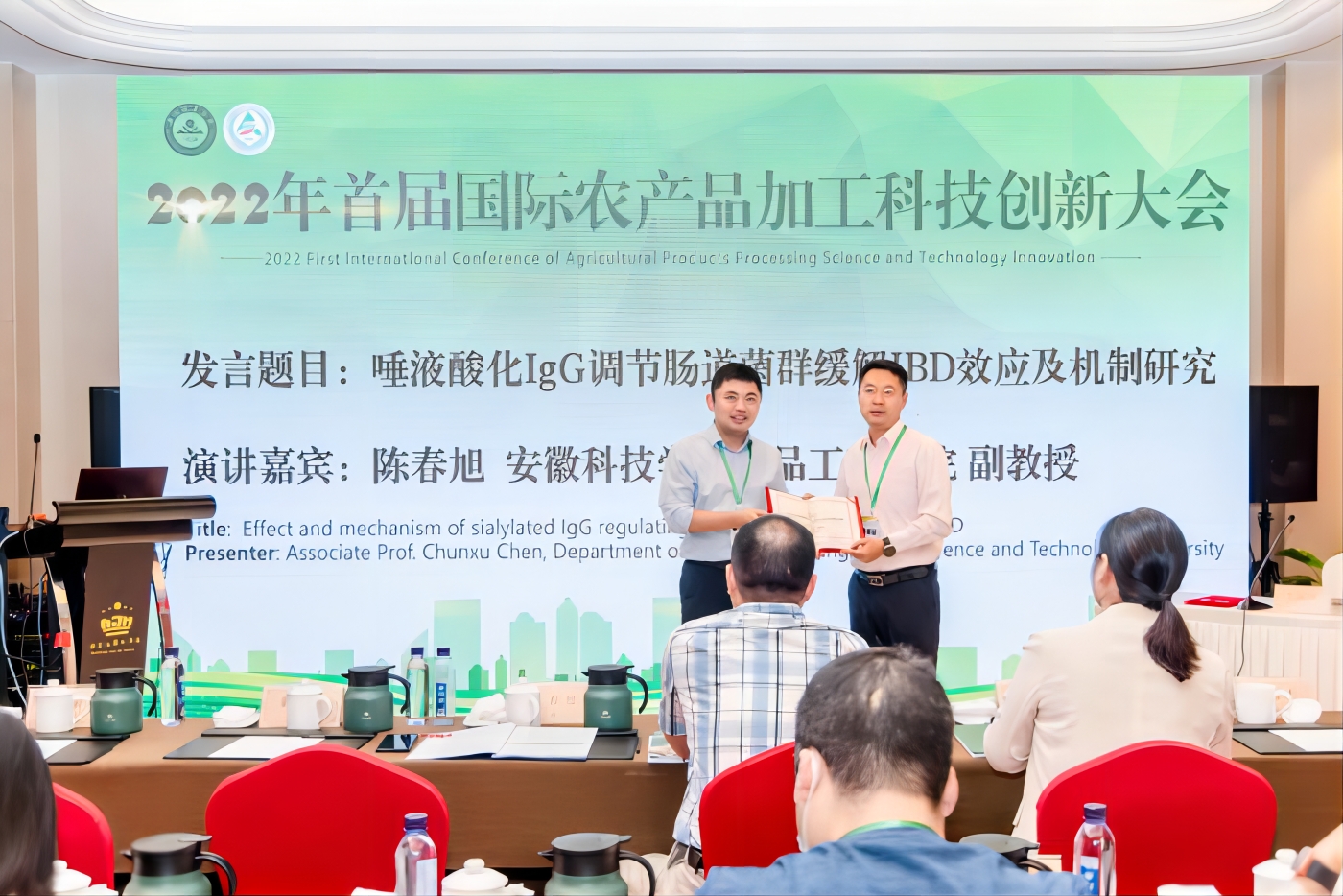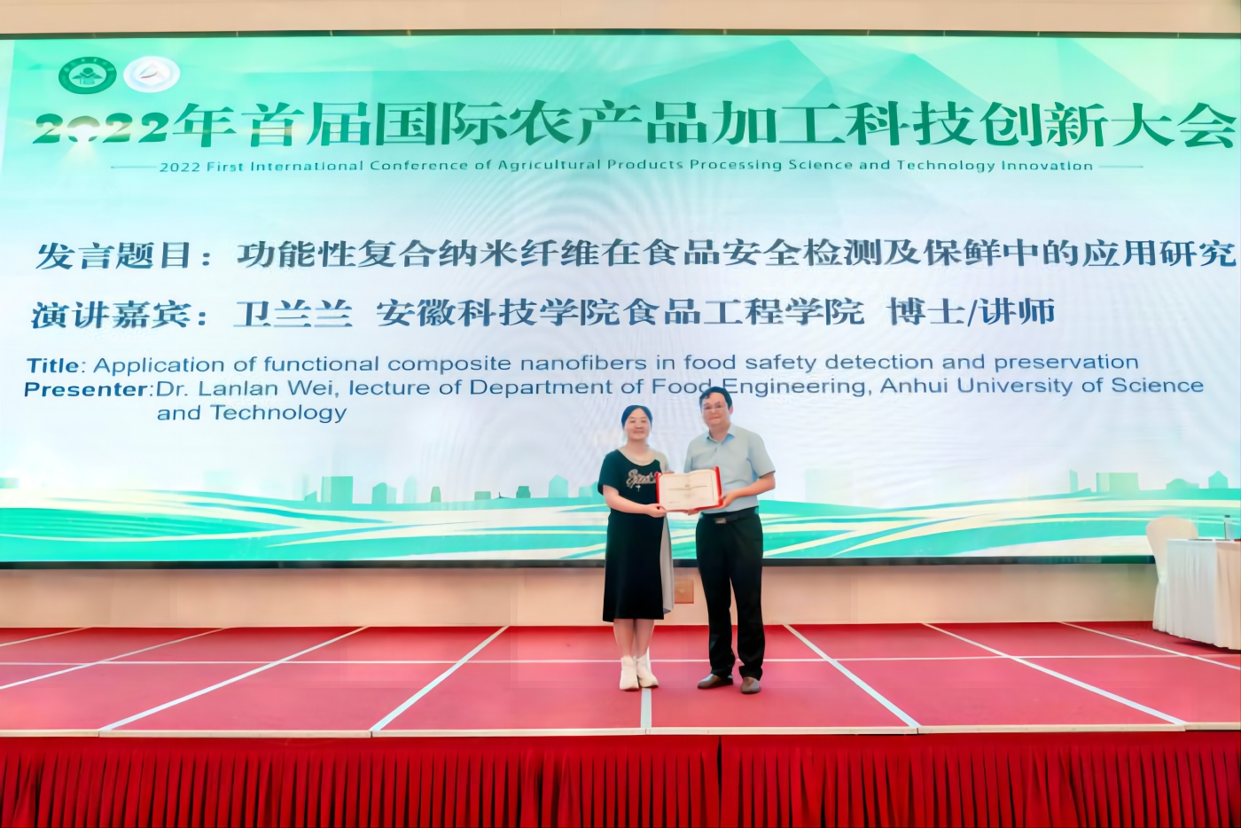 本次大会邀请的朱蓓薇院士、谢明勇院士、熊幼翎教授、金征宇教授、涂宗财教授和宛晓春教授分别做了题为《中式预制菜肴产业的传承与创新》《植物基乳酸菌发酵食品研发与产业化》《植物基肉替代品的市场趋势和技术创新》《特医食品及低GI淀粉基食品配料开发》《新型功能型鱼蛋白胶制备及其精深加工技术研究》和《黄大茶加工技术创新与营养健康》的大会主题报告。杜传来教授作为主持人主持了食品质量安全与检测分论坛。我院三位青年教师陈春旭副教授、卫兰兰博士和于鲲博士应邀分别做了题为《唾液酸化IgG调节肠道菌群缓解IBD效应及机制研究》《功能性复合纳米纤维在食品安全检测及保鲜中的应用研究》和《低GI绿茶高粱挂面的品质改良及消化特性研究》的报告,三位老师的报告引起参会代表的热烈反响和广泛关注,并获得了由大会组委会颁发的优秀论坛报告证书。