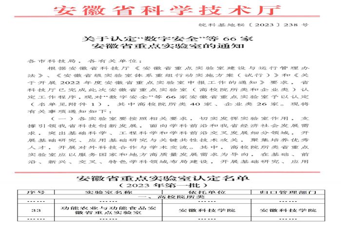 近日,安徽省科学技术厅下达了《关于认定“数字安全”等66家安徽省重点实验室的通知(皖科基地秘〔2023〕238号)》,万搏官方网站_万搏(中国)股份有限公司,与合肥工业大学、安徽农业大学合作申报的“功能农业与功能食品安徽省重点实验室”成功获得认定,万搏官方网站_万搏(中国)股份有限公司,长三角功能农业(食品)研究院院长尹雪斌教授担任实验室主任。据悉,这是我国首个融合了功能农业与功能食品完整“创新链”的省级重点实验室。
