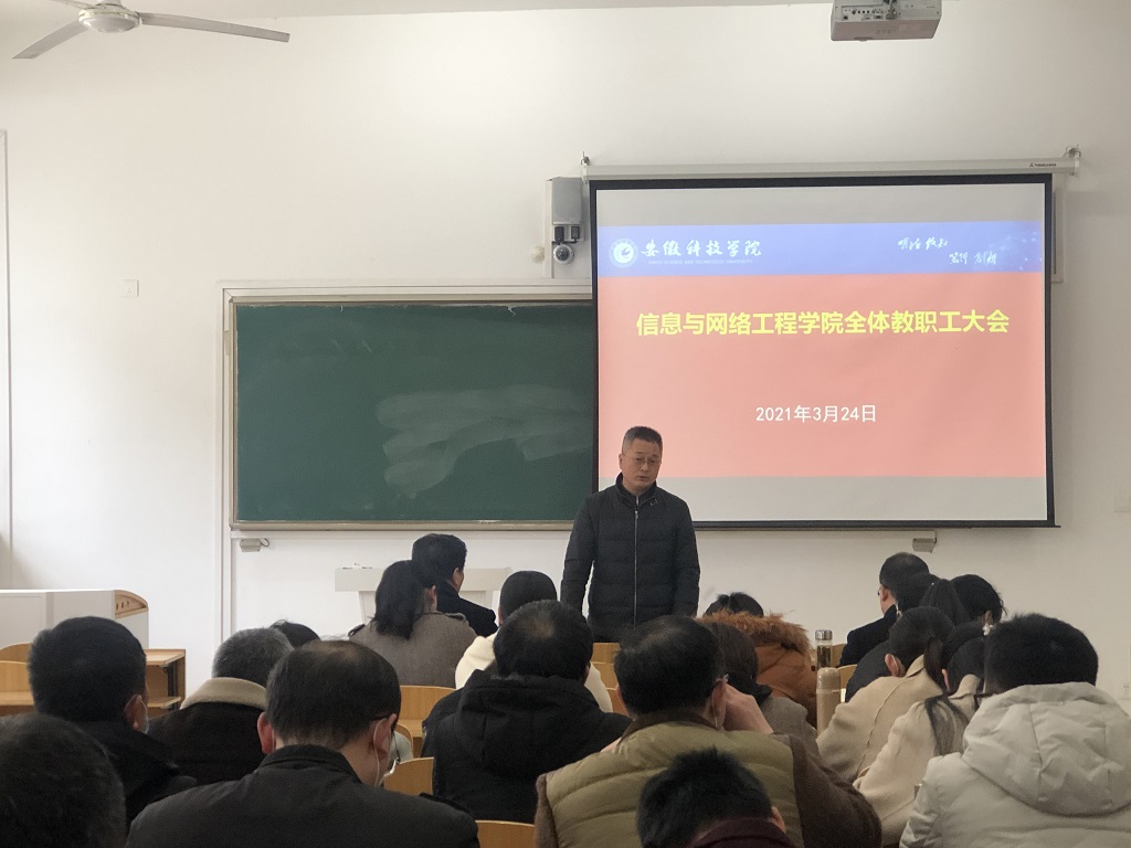 3月24日下午,信息与网络工程学院在致知楼C105召开全体教职工大会,回顾和总结学院2020年各项工作,部署学院新学期各项工作。信息与网络工程学院党委书记王振其、正处级组织员周向群,党委副书记韦乃学,副院长何恩节,副院长曹浩及全体教职工参加会议,会议由王振其主持。