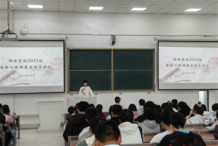 10月13日,财经学院在致知楼B111教室召开宿舍心理健康宣传员培训会。学院全体宿舍心理健康宣传员参会。会上,学院团委书记、心理辅导老师薛枫强调了宿舍心理健康宣传员的工作职责和角色定位,指出宿舍心理健康宣传员是心理健康教育工作中的一支重要力量,是校园心理健康四级预警工作网络中最基础、最前线,也是最重要的一级。她希望与会人员认真履行职责,构建好宿舍心理安全防线,为同学们营造良好的宿舍氛围,为宿舍搭建优质有效的社会支持系统。