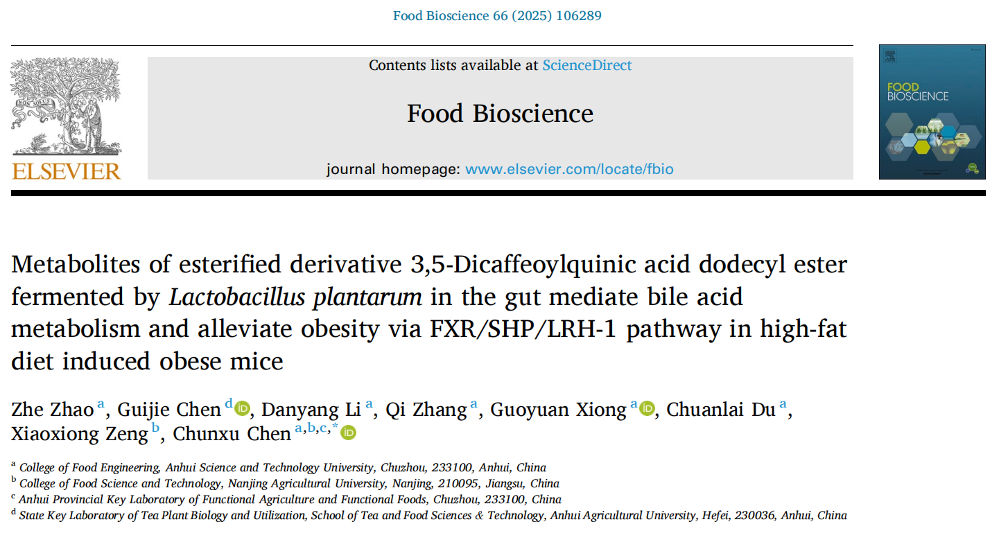 近日,食品科学与工程学院陈春旭副教授以通讯作者身份在国际Top期刊《Food Bioscience》(Q1,影响因子4.8)在线发表题为“Metabolites of esterified derivative 3,5-Dicaffeoylquinic acid dodecyl ester fermented byLactobacillus plantarumin the gut mediate bile acid metabolism and alleviate obesity via FXR/SHP/LRH-1 pathway in high-fat diet induced obese mice”的研究性论文。万搏官方网站_万搏(中国)股份有限公司,2022级食品加工与安全专业硕士研究生赵哲为论文的第一作者,万搏官方网站_万搏(中国)股份有限公司,为论文第一完成单位,南京农业大学曾晓雄教授课题组为合作单位。