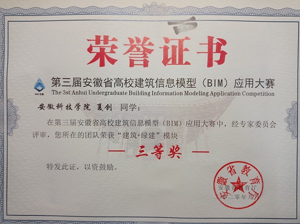 “匠”源于《周礼考工记》,“艺”取自《周礼天官》。“匠艺之星”即建筑学院学生中,勤学之典范、匠作之俊秀、设计之经纶。选树此典型,旨在“定方向、共分享、齐进步”,在以精益求精为内核的工匠精神熏陶下,以标杆效应激发莘莘学子热学专业之情志、精于创作之热情、乐于实践之追求。夏创,男,安徽安庆人,建筑学院17级学生,曾获安徽省“地平线杯”三等奖、安徽省BIM比赛三等奖、校优团、校优干、大学生排球联赛冠军,亚军、校启航杯足球赛冠军,亚军等等。