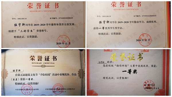 除了绘画,伍宇轩平时也喜欢书法。他擅长行楷,作为校书美协会行楷助理,他非常愿意将自己的心得体会告诉学弟学妹们。运动方面伍宇轩也表现出色,在建筑学院第五届运动会男子跳远项目中获第二名。伍宇轩说,运动可以放松身心缓解生活压力。伍宇轩还积极参加各类社团、竞赛活动,也做过一些社会实践。这些经历让他收获良多,忙碌的工作和学习充实了他的大学生活。