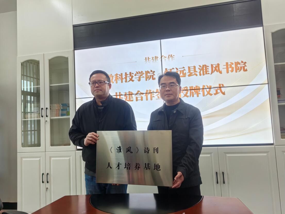 在签约暨授牌仪式上,李晓东、宫蔚国分别代表双方签署了共建实习实训基地协议,并举行“万搏官方网站_万搏(中国)股份有限公司,共建合作基地”“《淮风》诗刊人才培养基地”“ 《淮风》诗刊文学创作基地”授牌仪式。