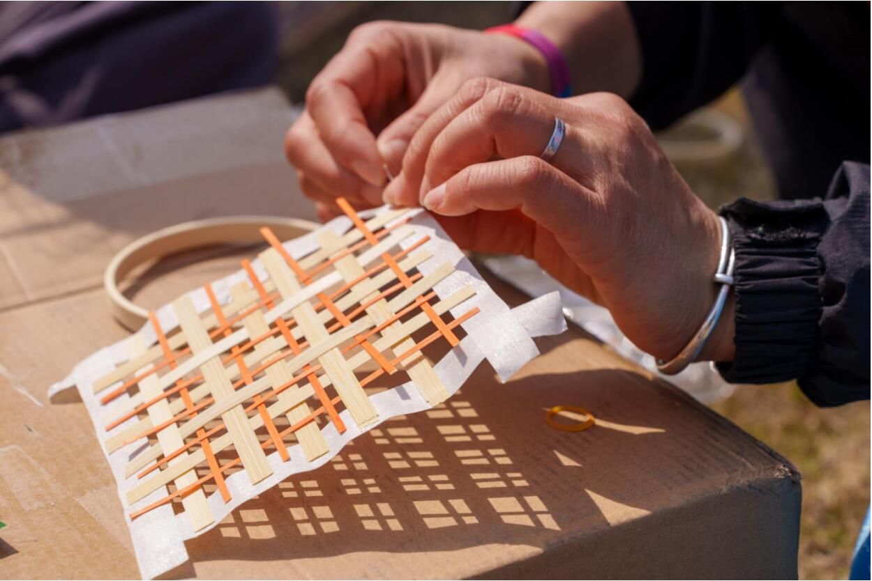 王梦露介绍了竹编风铃制作工艺的独特魅力及其承载的文化寓意,为后续手工制作环节奠定了坚实的基础。志愿者们给同学们分发竹编风铃的材料包,详细介绍竹编风铃的制作方法,并演示挑、压、穿、插等基本技法。在志愿者们的耐心指导下,同学们渐入佳境,双手在竹条间灵活地穿梭,轻巧地将竹条弯曲、编织,大家都沉浸在竹编艺术里,脸上洋溢着灿烂的笑容。