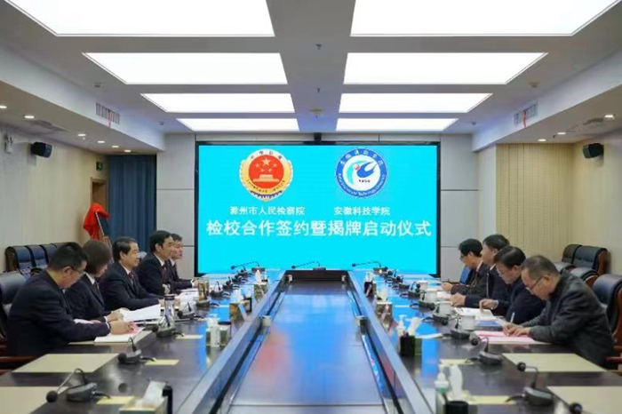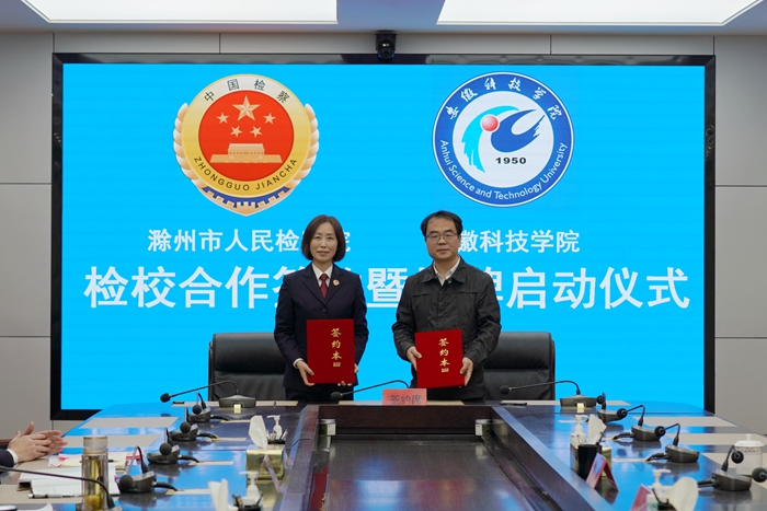 11月28日下午,校党委书记时伟赴滁州市人民检察院,出席校检合作签约暨实习实训基地揭牌仪式。校党委(校长、法治)办公室主任卢星辰,人文学院党委副书记、副院长李晓东,法学系教授宣刚;滁州市人民检察院党组书记、检察长李玉科,副检察长高潮,检委会专职委员喻尊晏,第七检察部主任王昌杰,办公室主任毕西先等出席仪式。