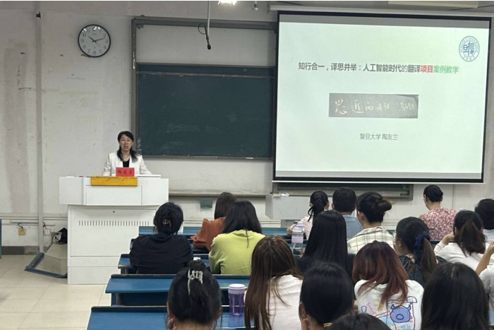 学科专业建设报告会邀请复旦大学外文学院博士生导师、翻译系主任、翻译硕士教育中心主任、国际传播领军人才陶友兰教授现场讲学,指导翻译学科建设、翻译专业人才培养及人工智能时代翻译教学。陶教授以“知行合一,译思并举:人工智能时代的翻译项目案例教学”为题,围绕人工智能对翻译教育与学习的挑战,深入剖析翻译实践教学面临的问题及对策,以真实翻译项目的案例教学为例,介绍了复旦大学以技术赋能翻译人才培养的举措与经验。关于外国语学院学科专业建设,陶教授紧紧结合外国语学院自身实际,重点分享了翻译学科建设中的问题与对策,提出高层次、应用型及职业化的发展定位,以澳、德、英、美等国及复旦大学的翻译人才培养为案例,阐述经验与启示,解答学科建设中的盲点和痛点。