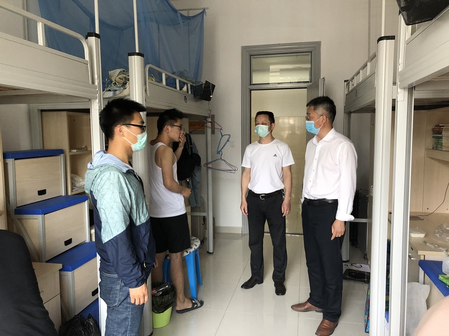 在走访学生宿舍过程中,领导们叮嘱学生要做好晨午晚体温测量和登记,勤洗手、戴口罩,多通风,不串门,出现异常情况第一时间向班主任和辅导员报告。