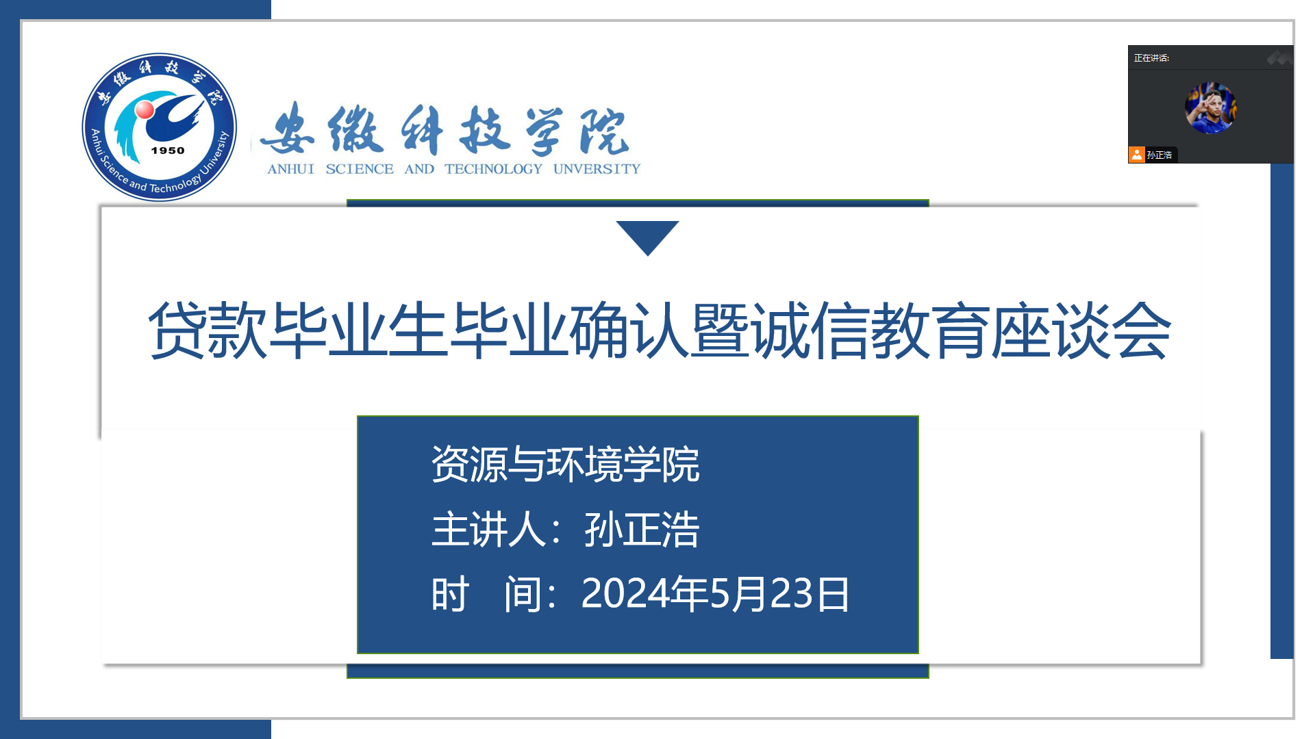 5月23日晚,资源与环境学院通过腾讯会议线上召开毕业生诚信还贷宣讲会。会议由学院资助工作联系人孙正浩主持,2024届贷款毕业生参加会议。会上,孙正浩向同学们传达了学校关于毕业生诚信还款工作的通知精神,详细解读了国家助学贷款的还款政策,明确还款方式、还款时间、还款流程和注意事项,考上研究生的同学可以按程序申请展期。他强调,自觉履行还贷是毕业生的责任和义务,维护良好的信用记录对于个人的发展具有重要意义,并指出不良信用记录对个人产生的影响,学生应遵循助学贷款的相关协议,了解还款知识、违约后果,履行相关义务。同时,他要求每位贷款学生要及时办理毕业贷款的网上确认工作,如发现问题,应及时与老师、贷款银行联系。
