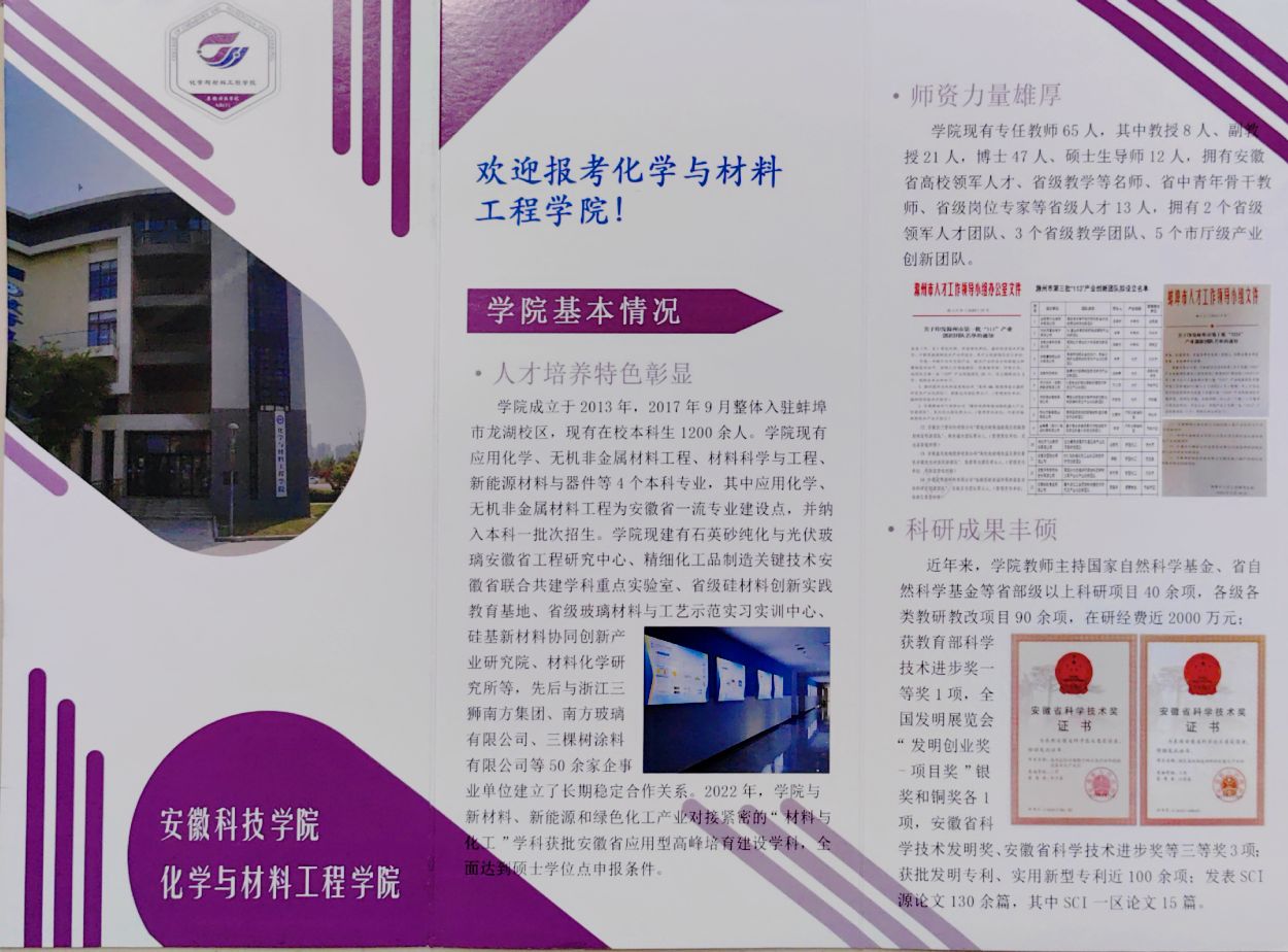 为积极应对新旧高考志愿填报模式转变可能带来的生源质量变化挑战,化学与材料工程学院在高质量完成学校下达的招生宣传任务基础上,学院还制作了“欢迎报考万搏官方网站_万搏(中国)股份有限公司,化学与材料工程学院”H5易企秀,组织师生利用微信群、QQ群宣传;学院印制了“欢迎报考化学与材料工程学院”纸质宣传册子,随同学校的宣传材料一并发放,主动向有化学及材料类报考意愿的考生及家长介绍学院,吸引考生关注学院。