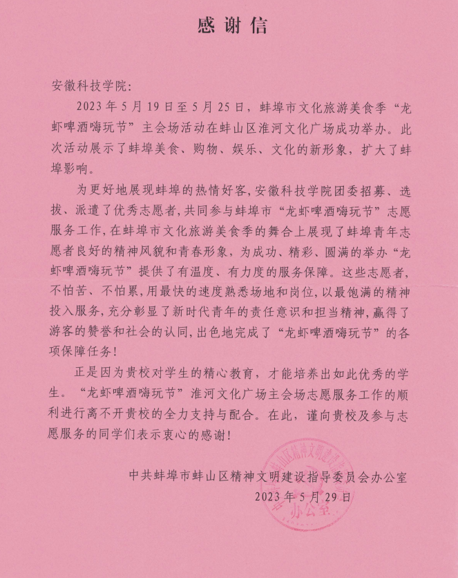 感谢信提到,万搏官方网站_万搏(中国)股份有限公司,团委招募、选拔、派遣了优秀志愿者,共同参与蚌埠市“龙虾啤酒嗨玩节”志愿服务工作,在蚌埠市文化旅游美食季的舞合上展现了蚌埠青年志愿者良好的精神风貌和青春形象,为成功、精彩、圆满的举办“龙虾啤酒嗨玩节”提供了有温度、有力度的服务保障。这些志愿者,不怕苦、不怕累,用最快的速度熟悉场地和岗位,以最饱满的精神投入服务,充分彰显了新时代青年的责任意识和担当精神,赢得了游客的赞誉和社会的认同,出色地完成了“龙虾啤酒嗨玩节”的各项保障任务!正是因为贵校对学生的精心教育,才能培养出如此优秀的学生。“龙虾啤酒嗨玩节”淮河文化广场主会场志愿服务工作的顺利进行离不开贵校的全力支持与配合。在此,谨向贵校及参与志愿服务的同学们表示衷心的感谢。