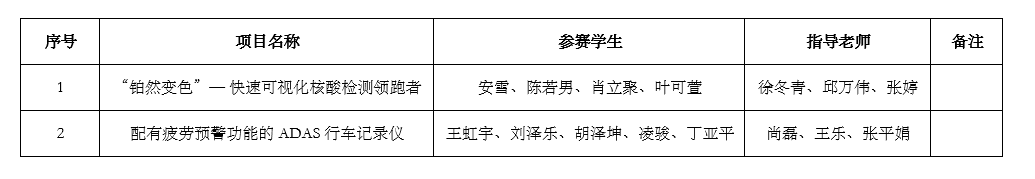 我校2023年“挑战杯”大学生课外学术科技作品竞赛自2023年2月启动,校领导高度重视,精心组织专家辅导,积极推报优秀作品参加比赛。经省赛评选,现将入围国赛项目名单公示如下: