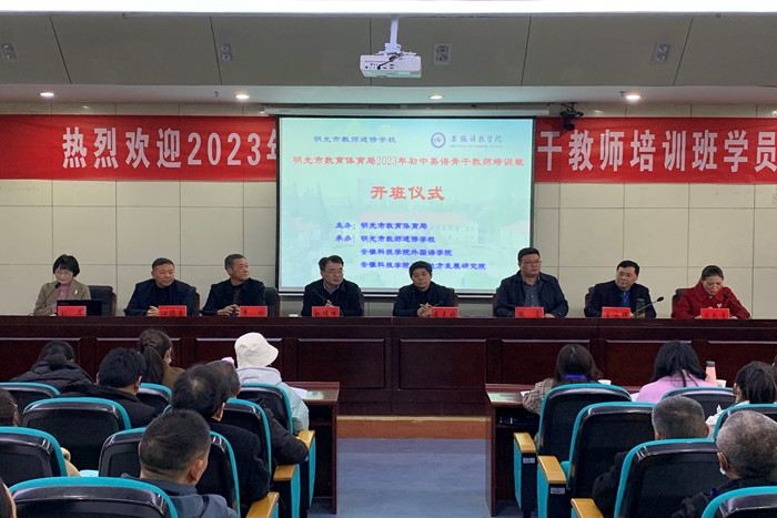 3月18日,明光市2023年初中英语骨干教师培训班在我校新图书馆一楼报告厅举行开班仪式。明光市教育体育局人事与师资科科长李克好、明光市教师进修学校校长陶彦、明光市教育体育局英语教研室主任王庆祥先后代表主办单位、主管部门和参训教师讲话,我校教务处处长赵伟峰致欢迎辞,外国语学院院长刘萍介绍培训班基本情况。开班仪式由外国语学院党委书记蔡为青主持。本次培训班由外国语学院承办,来自明光市34所中学共60名英语骨干教师将参加为期4天的集中培训。